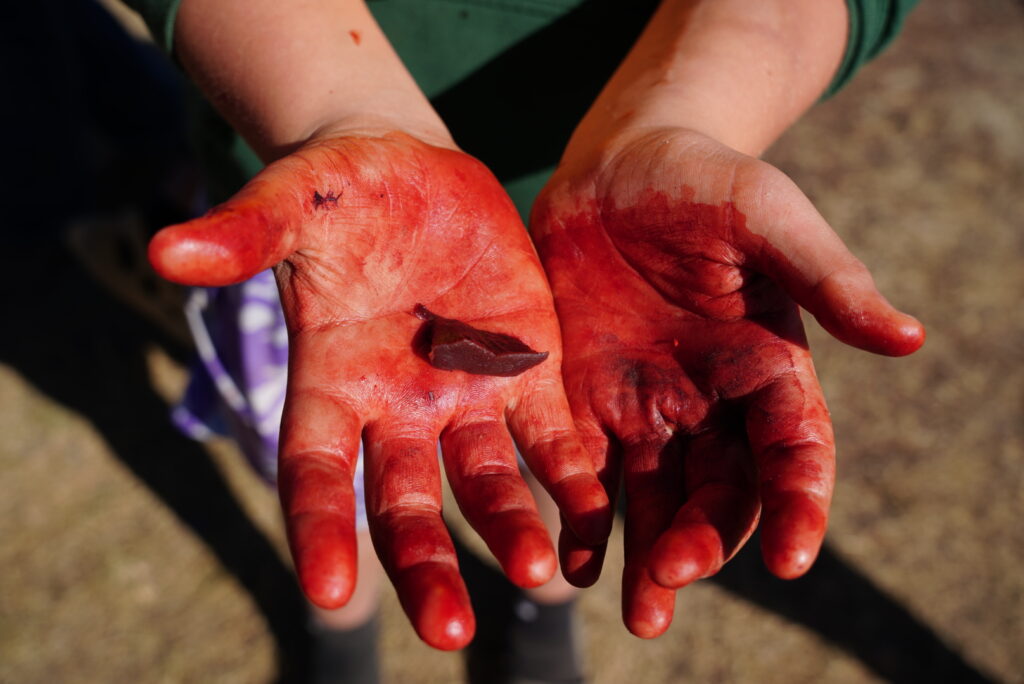 The students watched in rapture as the large bull was taken down and processed by ranch owner Robbie Magnan. Magnan explained the different body parts and their uses for food, clothing, and regalia. No part of the buffalo goes to waste. The buffalo’s liver is believed to signify strength, and Magnan said those who ate it would receive some of that strength. Some students took bites of the organ.