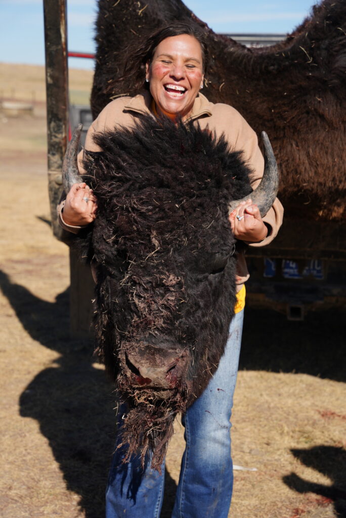 Herds of buffalo galloped in the distance, while leaders of the Buffalo Unity Project guided the students through teachings about the native mammal and its deep spiritual and cultural significance to the Nakoda and Dakota people. First on the agenda was a pipe ceremony, where each student cleansed themselves in sage and listened intently to the prayers and drum ceremony that is customary for the buffalo hunt. Next, they waited for Reyna Perez, their assistant principal and the chosen person to shoot the buffalo, to return.
